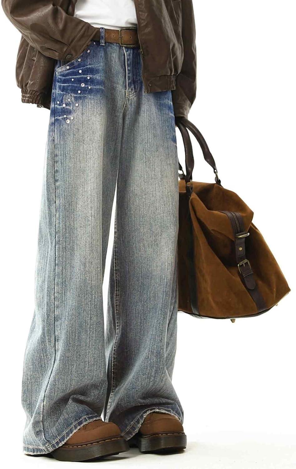 EMMIOL Womens Rivet Beading Rhinestone Wide Leg Jeans Low Rise Baggy Jeans Straight Denim Pants Trendy Fall