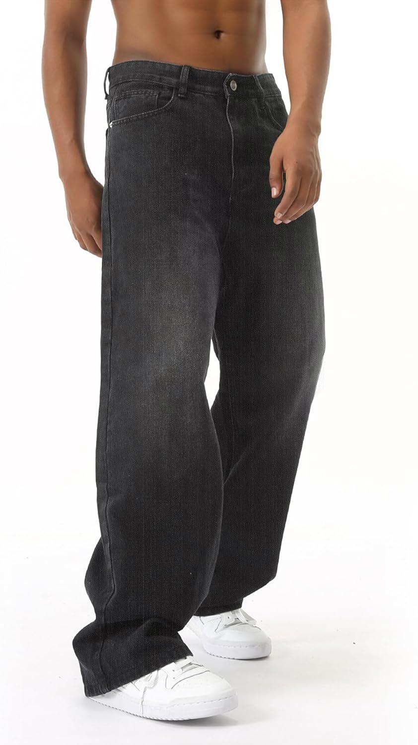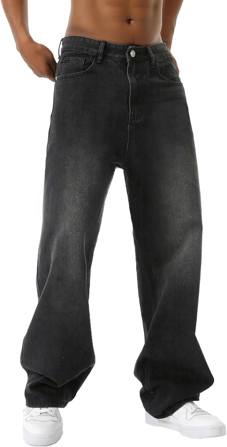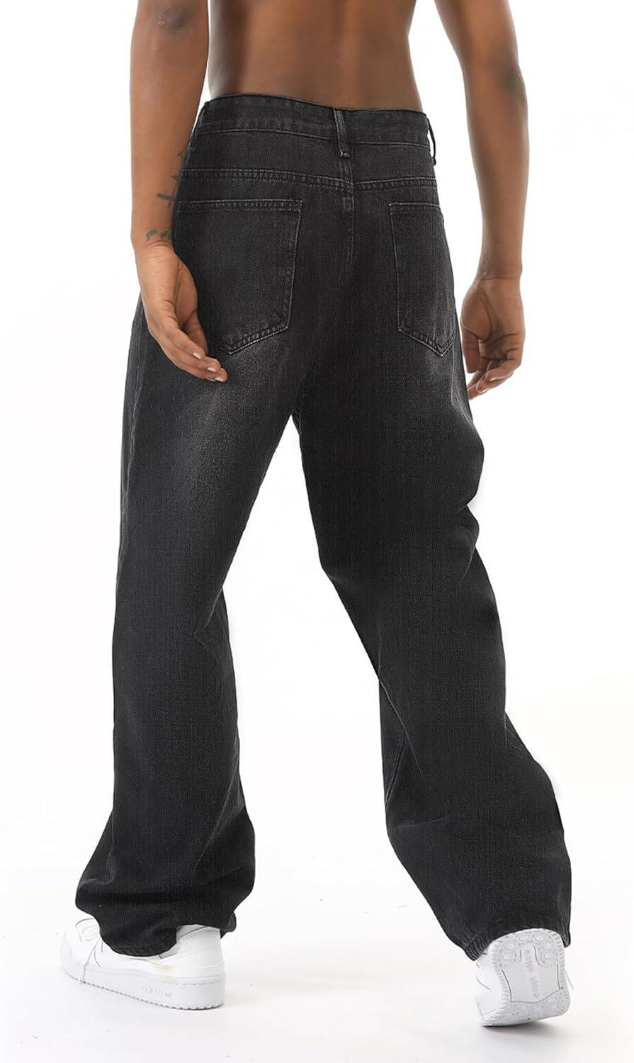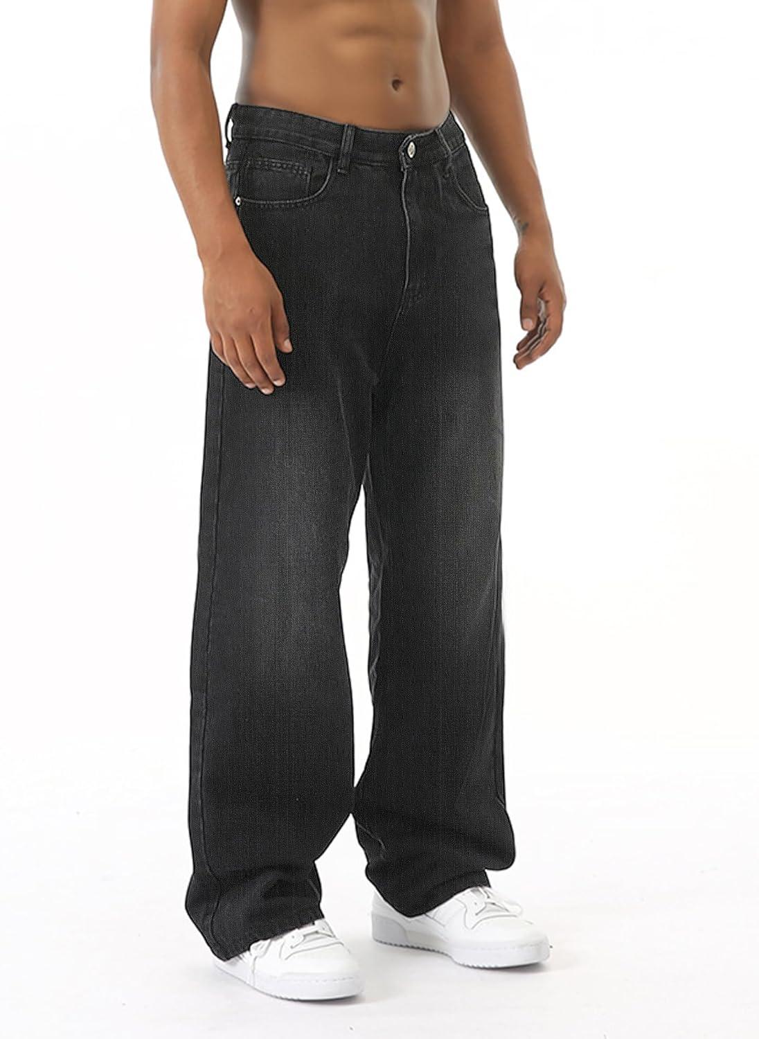 EMMIOL Baggy Jeans Men Wide Leg,Y2k Hip Hop Skater Denim Cargo Pants Casual Loose Fit,Relaxed Long Trousers(Black-c)