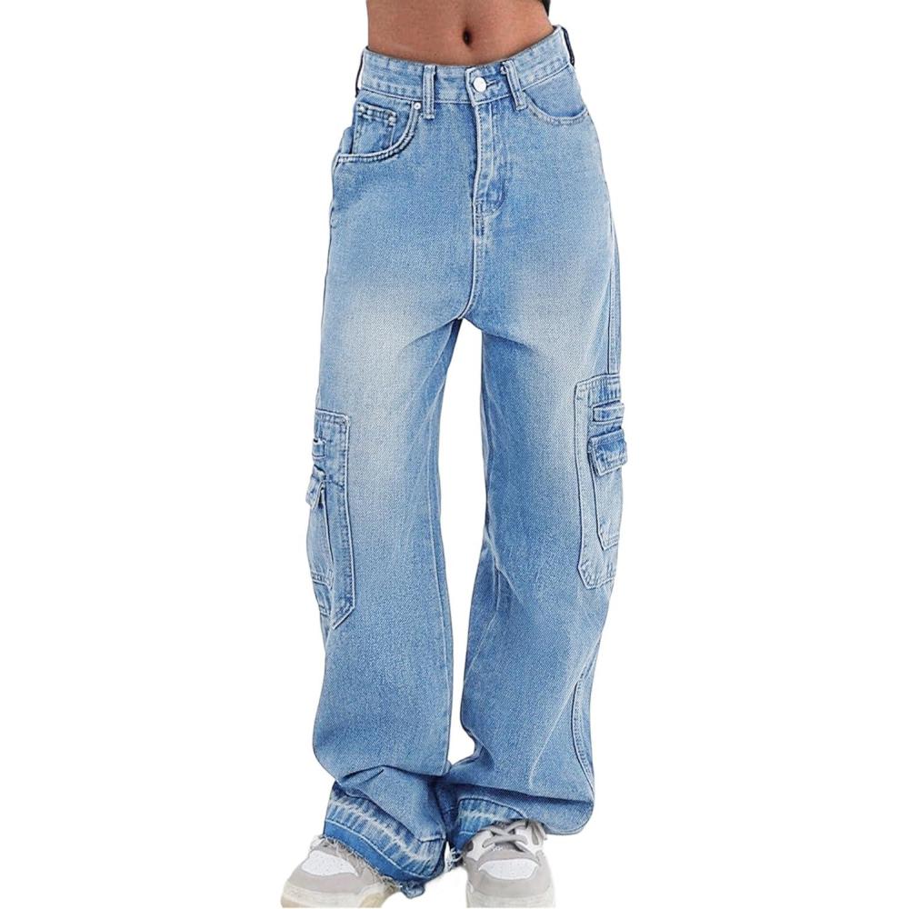 EMMIOL Cargo Pants Women Stretchy Wide Leg Baggy Jeans with Pockets Casual Trousers Y2K Vintage Streetwear Trendy 2025(Light Blue01)