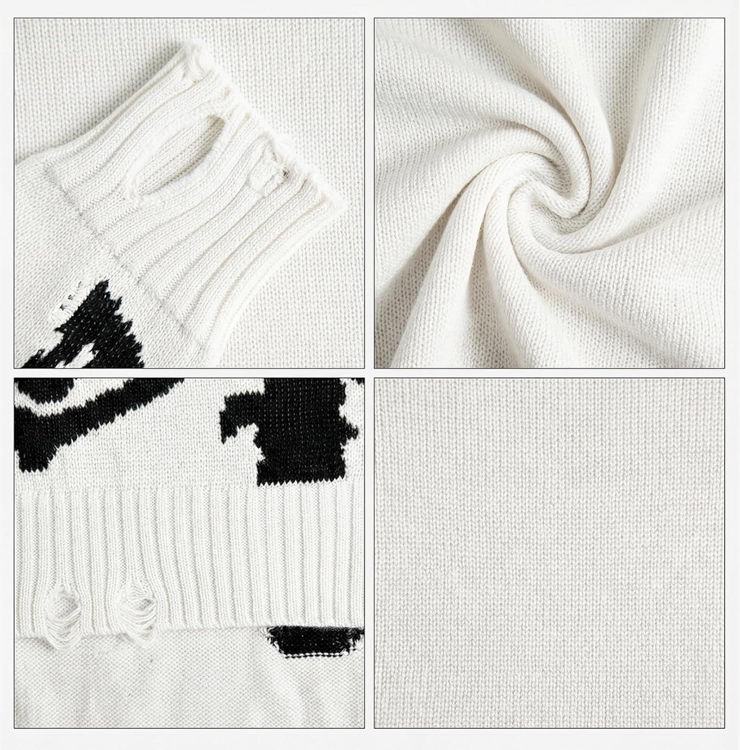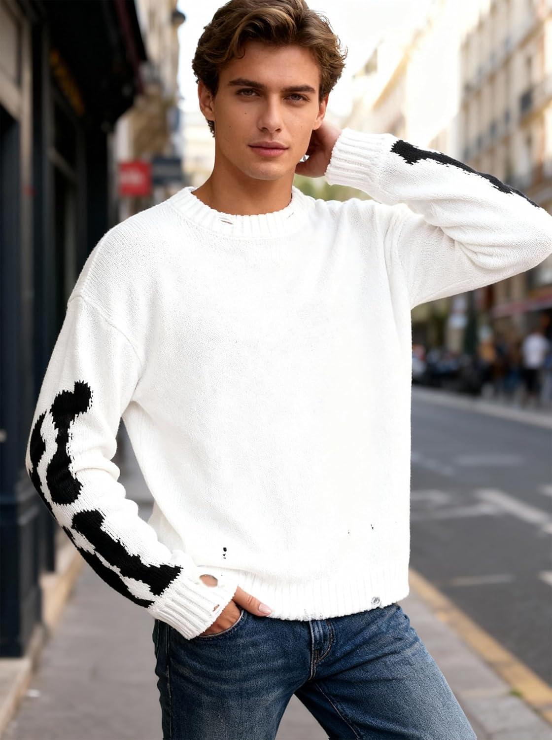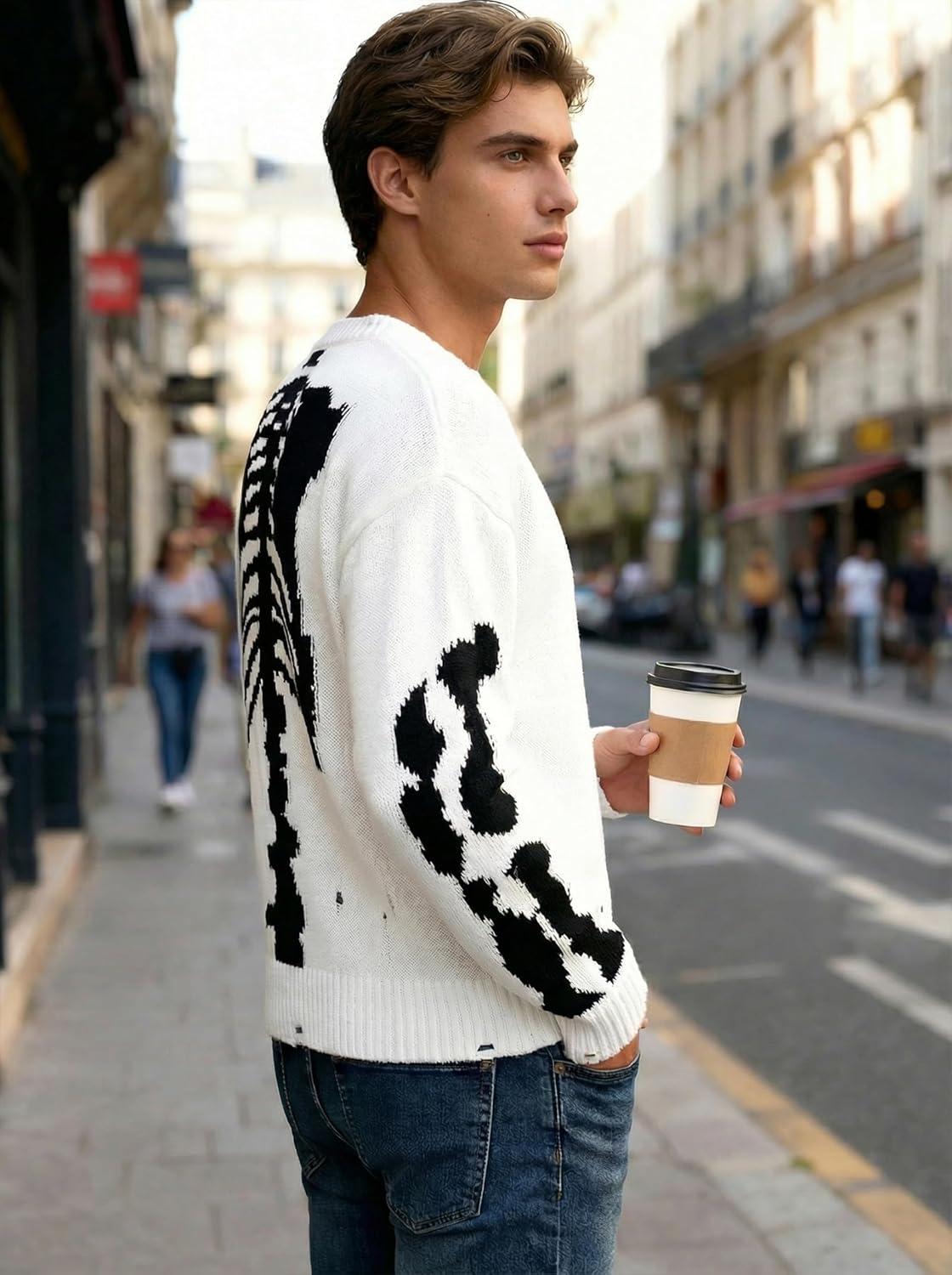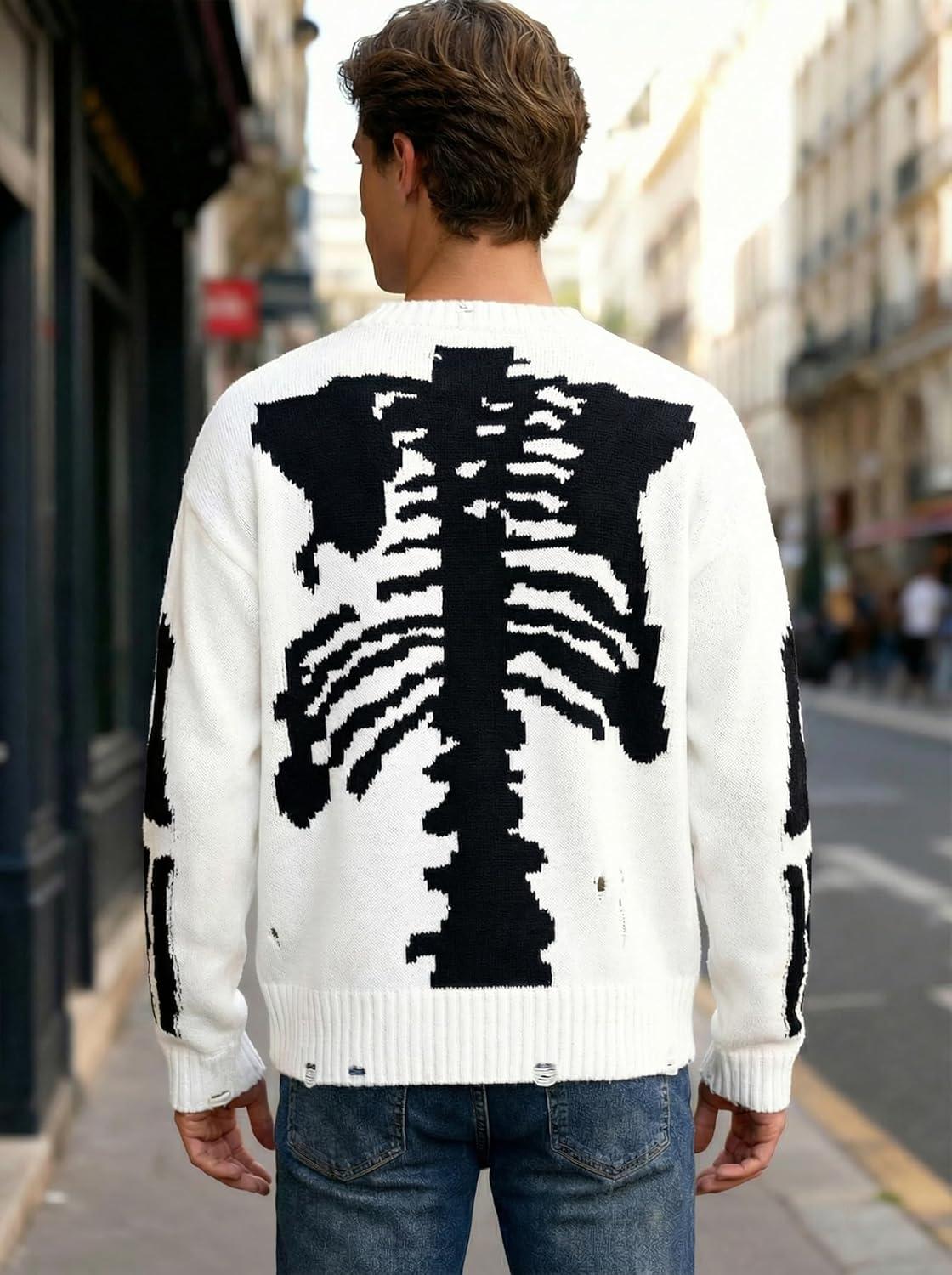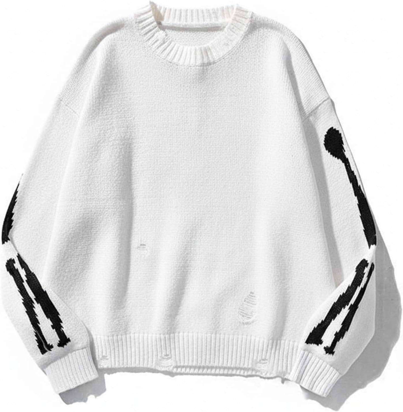 EMMIOL Fall Sweaters for Men Pull Over Cozy Sweaters Long Sleeve Crew Neck Skull Sweater(White)