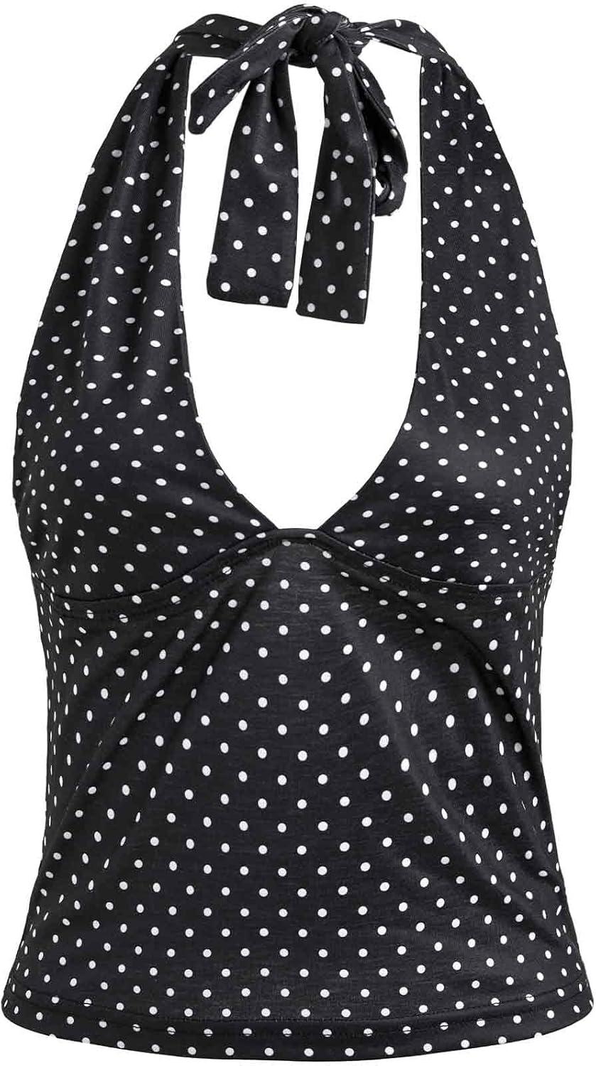 EMMIOL Halter Tops for Women Summer Crop Deep V Neck Blackless Tank Top Going Out Y2k Coquette Clothes(Black Polka Dot)
