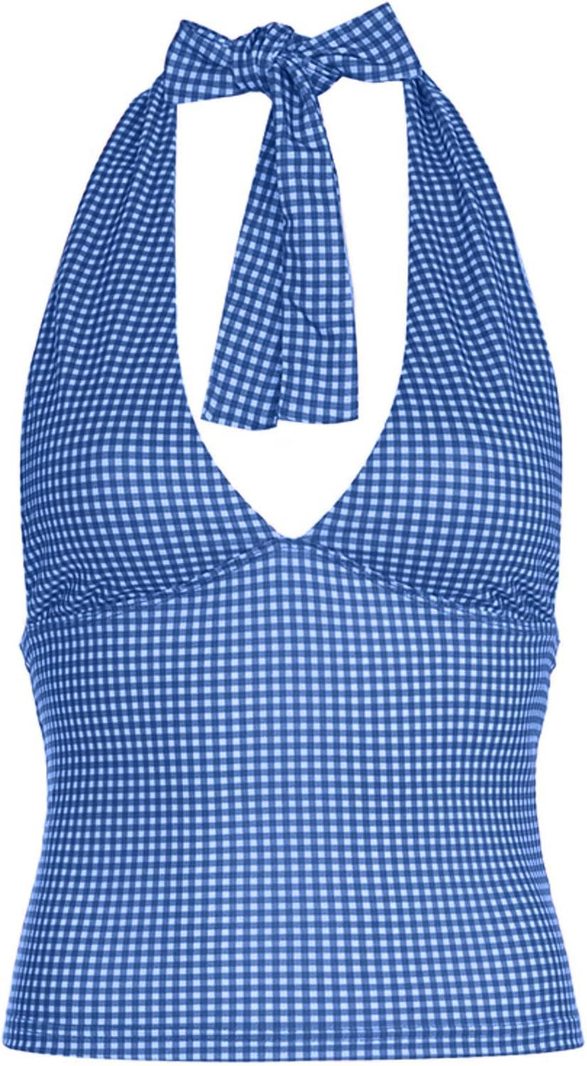 EMMIOL Halter Tops for Women Summer Crop Deep V Neck Blackless Tank Top Going Out Y2k Coquette Clothes(Blue Plaid)