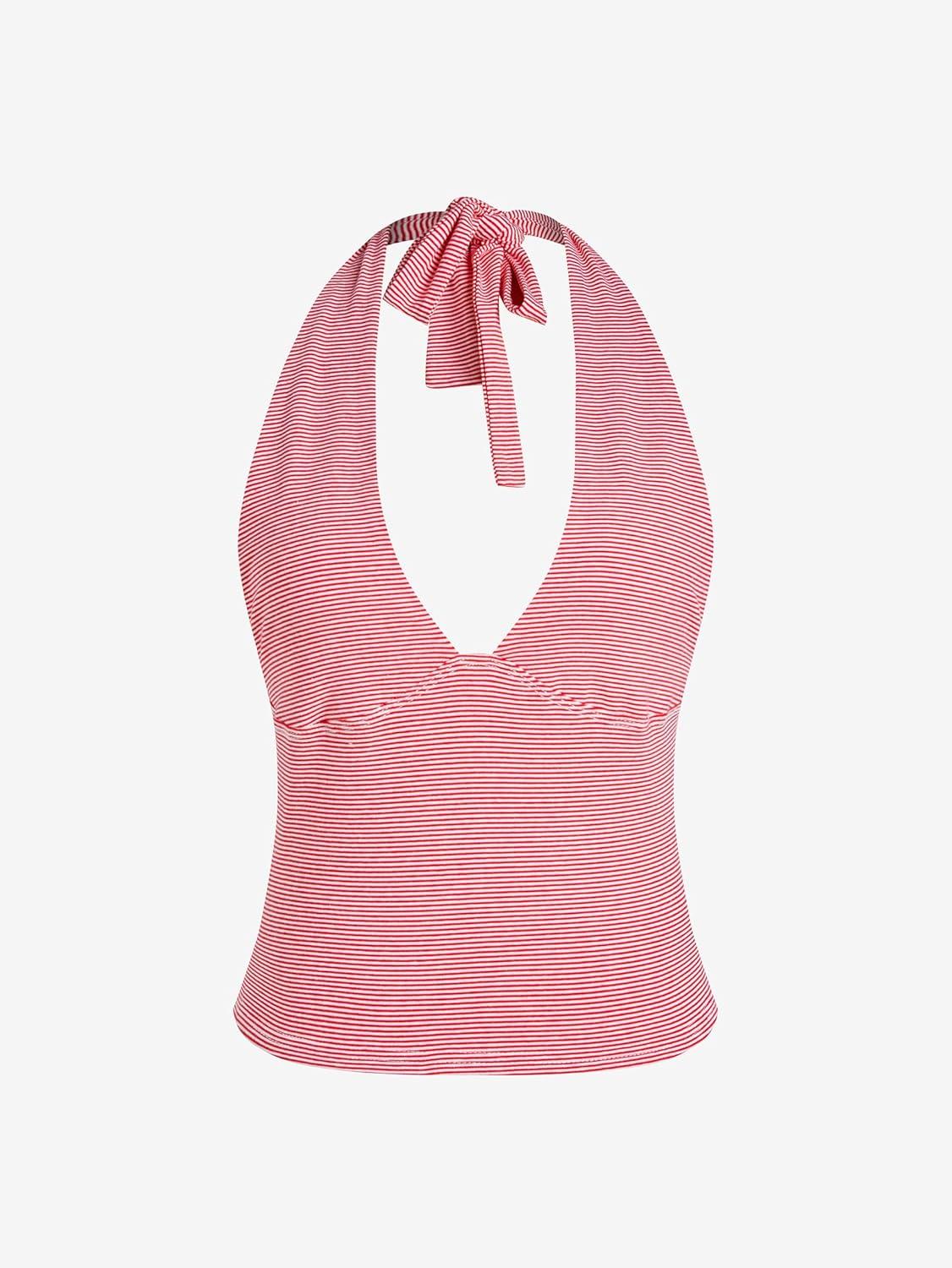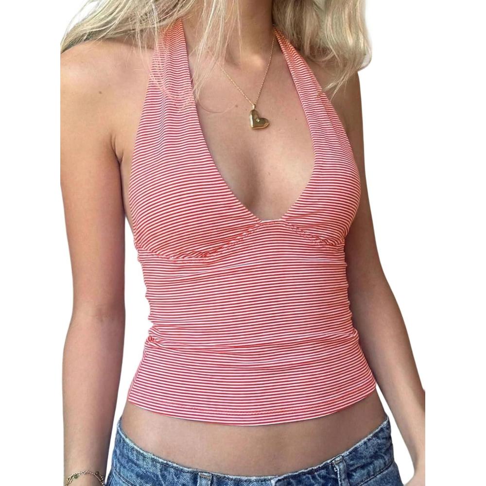 EMMIOL Halter Tops for Women Summer Crop Deep V Neck Blackless Tank Top Going Out Y2k Coquette Clothes(Red Striped)
