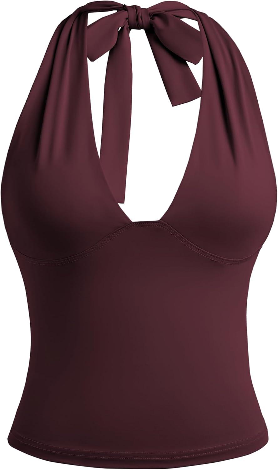 EMMIOL Halter Tops for Women Summer Crop Deep V Neck Blackless Tank Top Going Out Y2k Coquette Clothes(Wine Red)
