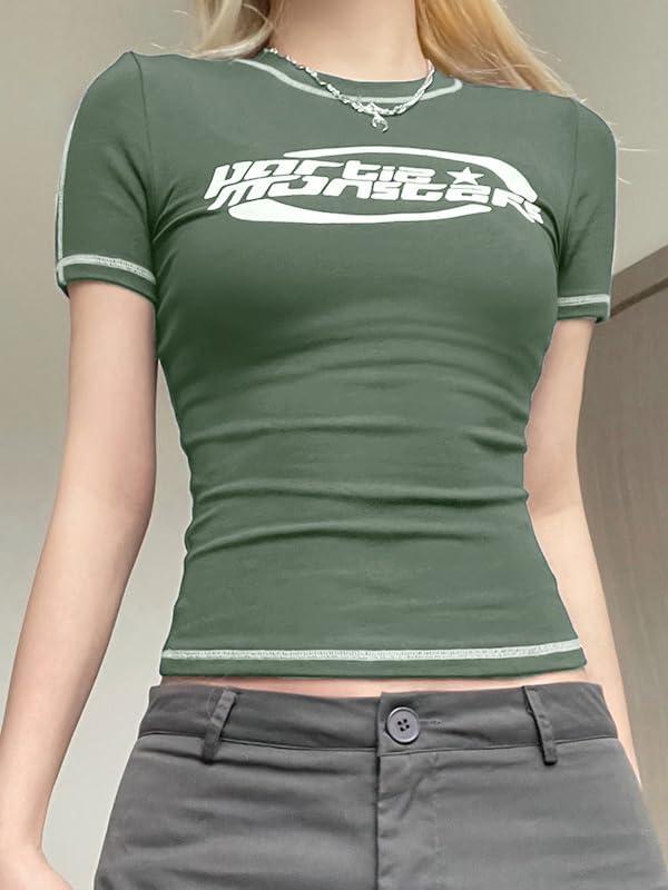 y2k tops stitched short sleeve logo graphic teeshirts for teens girls graphic crop tops for women baby crop tees womens crop tops cute summer scoop neck basic tees slim fit trendy short sleeve t shirts for teen girls 2023