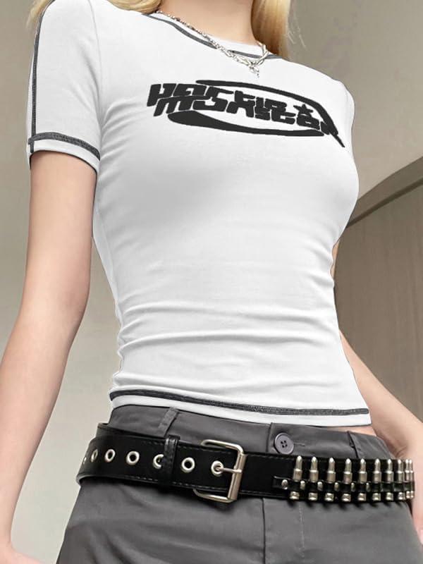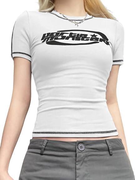 y2k tops stitched short sleeve logo graphic teeshirts for teens girls graphic crop tops for women baby crop tees womens crop tops cute summer scoop neck basic tees slim fit trendy short sleeve t shirts for teen girls 2023