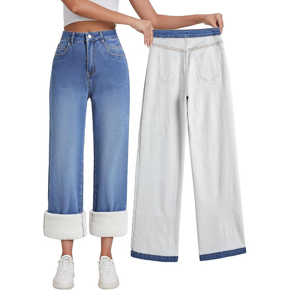 EMMIOL Women Baggy Jeans Mid-Low Waist Boyfriend Streetwear Vintage Jeans Wide Leg Denim Pants(Blue-(warm Fleece Lined))
