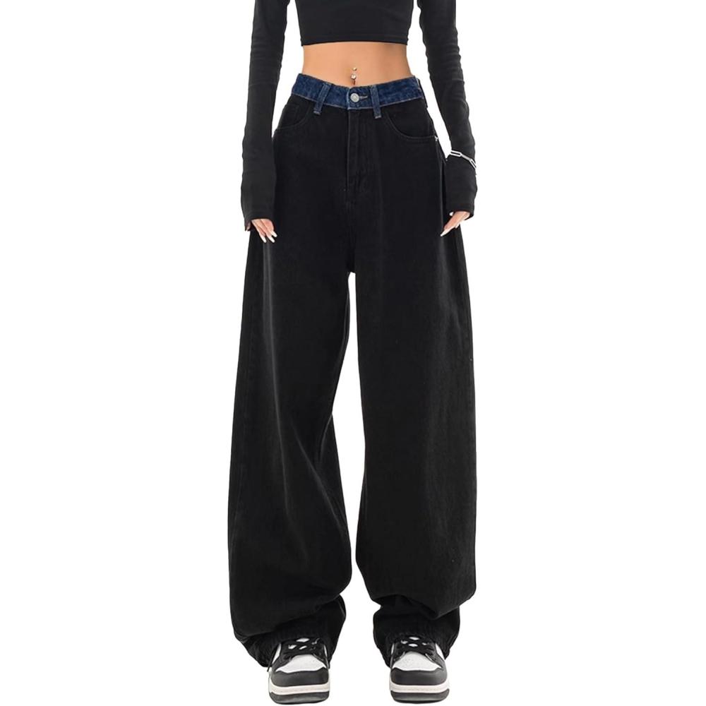 EMMIOL Women Baggy Jeans Patchwork Mid-Low Waist Wide Leg Jeans Boyfriends Pants 90s Loose Denim Pants(Black)