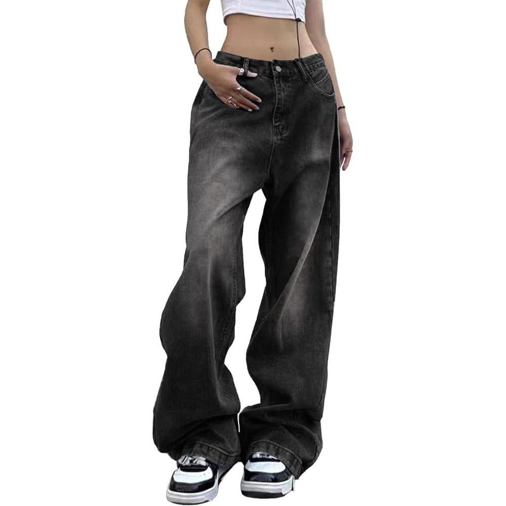 EMMIOL Women Wide Leg Jeans Mid-Low Waist Baggy Jeans Loose Boyfriends Jeans Y2K 90s Denim Pants(Black)