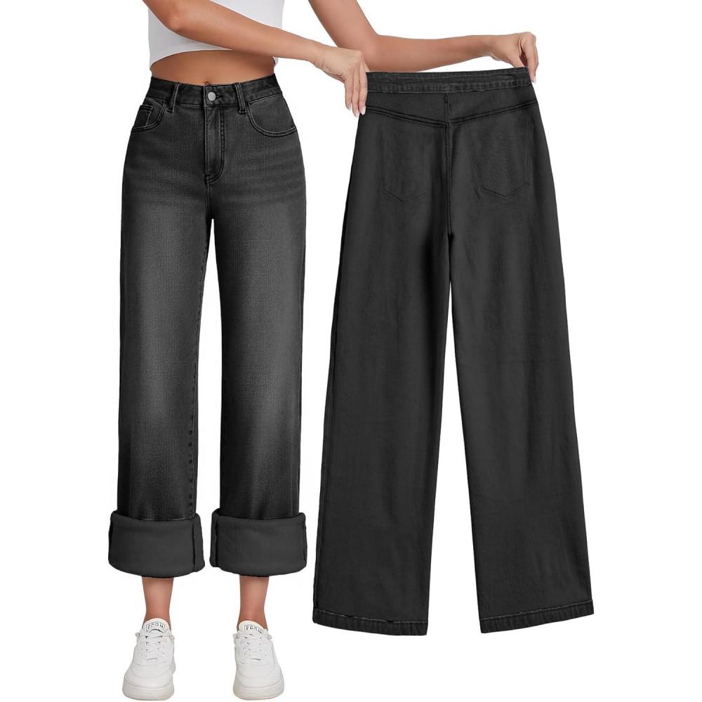 EMMIOL Women’s 2025 Wide Leg Jeans Distress Mid Waist Denim Pants Vintage Y2K Trousers(Black-(warm Fleece Lined))