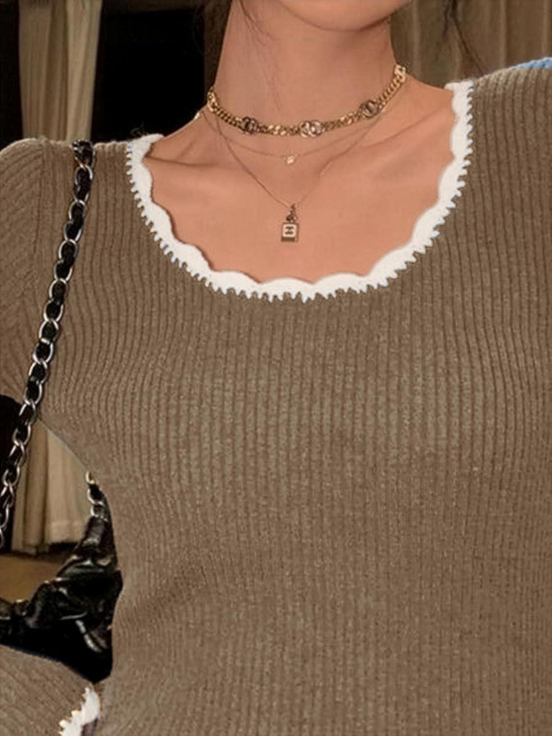 EMMIOL Womens Knit Cute Sweaters Ribbed Fitted Tops Scoop Neck Long Sleeve Shirts Going Out Y2K Outfits(Apricot)