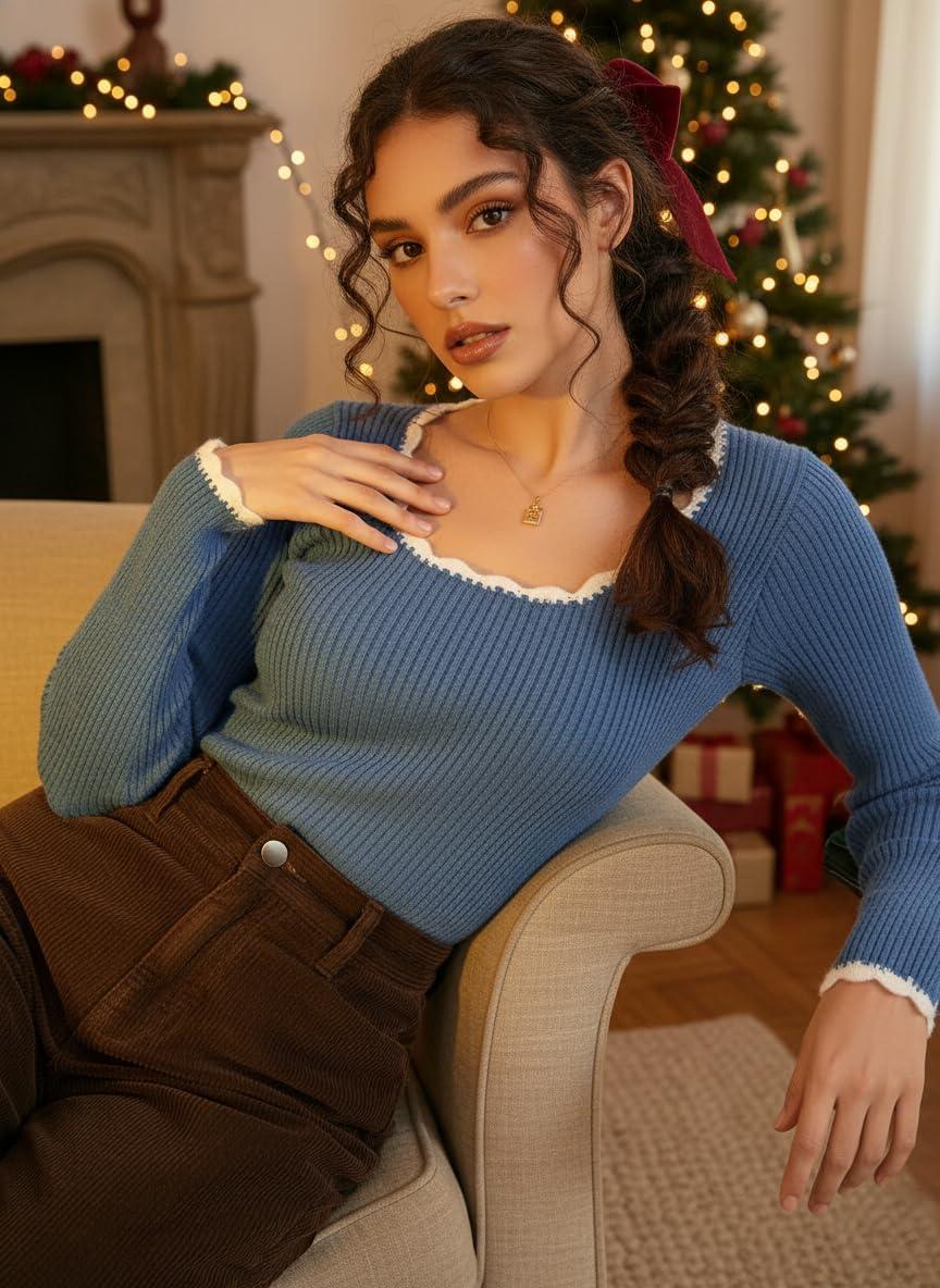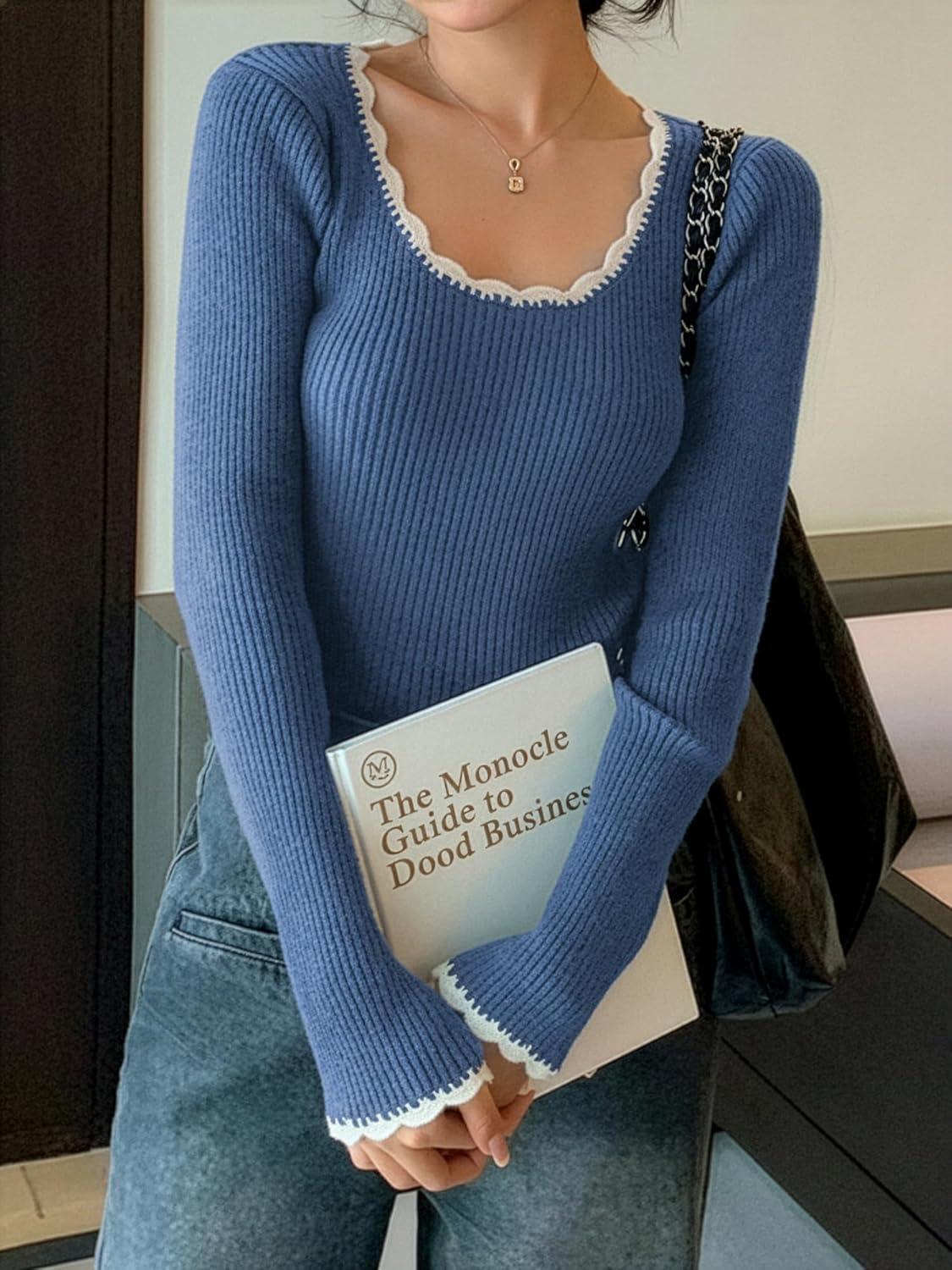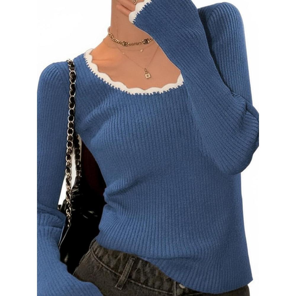 EMMIOL Womens Knit Cute Sweaters Ribbed Fitted Tops Scoop Neck Long Sleeve Shirts Going Out Y2K Outfits(Blue)