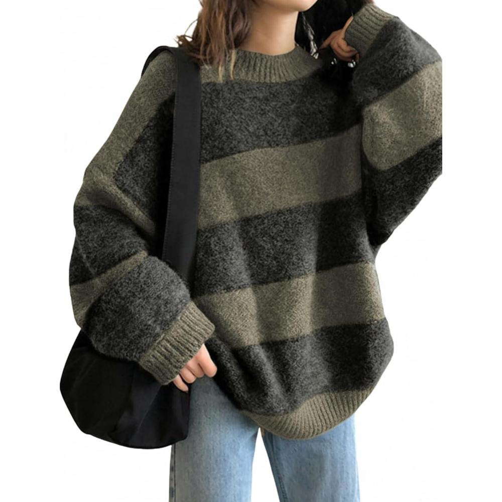 EMMIOL Women’s Oversized Striped Sweaters 2025 Fall Trendy Long Sleeve Knit Outfits Crewneck Fashion Pullover Tops(Grayish Green Stripe)