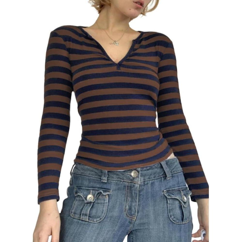 Striped Vintage Long Sleeve Crop Tops Coquette Aesthetic Clothes V Neck Y2K 2000S Shirts for Women(Brown)