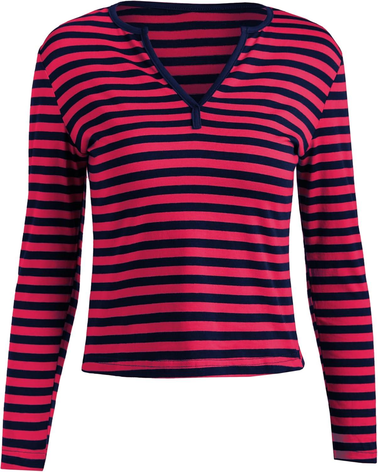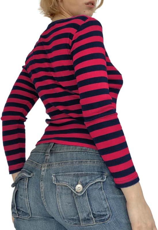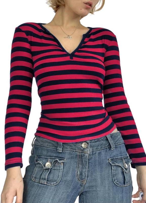 Striped Vintage Long Sleeve Crop Tops Coquette Aesthetic Clothes V Neck Y2K 2000S Shirts for Women(Red)