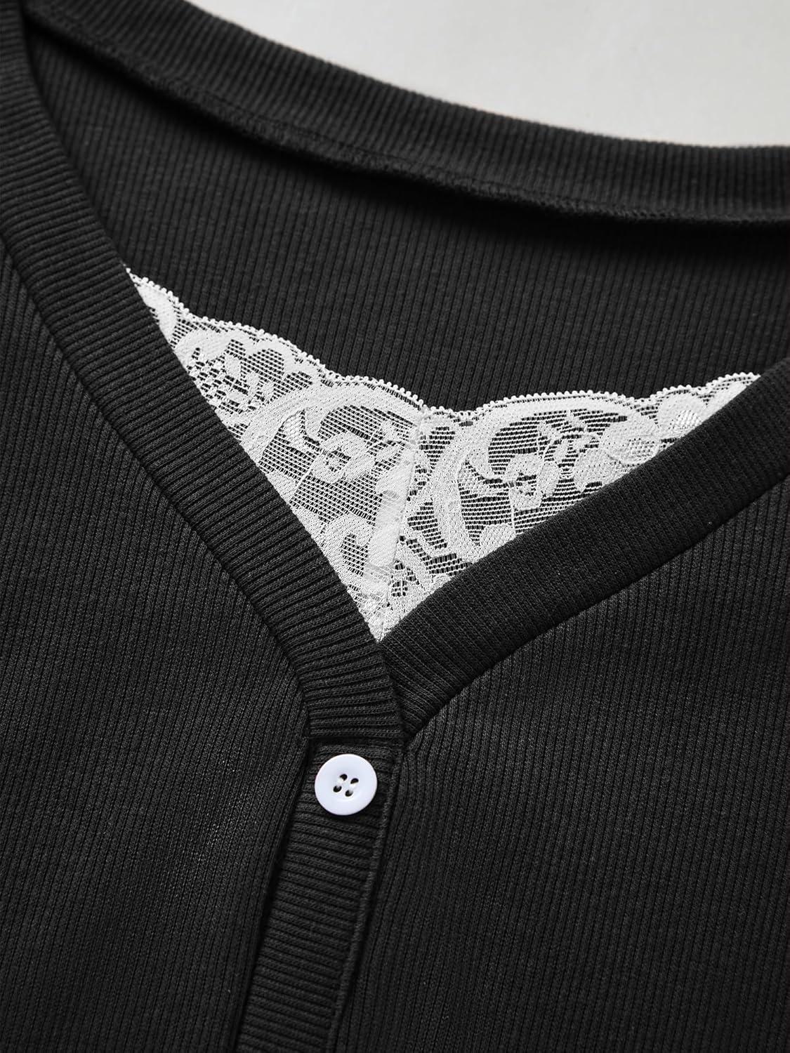 Womens Lace Long Sleeve Top Paneled Henley Shirts Y2k 2000s Fitted Going Out Tops Blouse(Black)