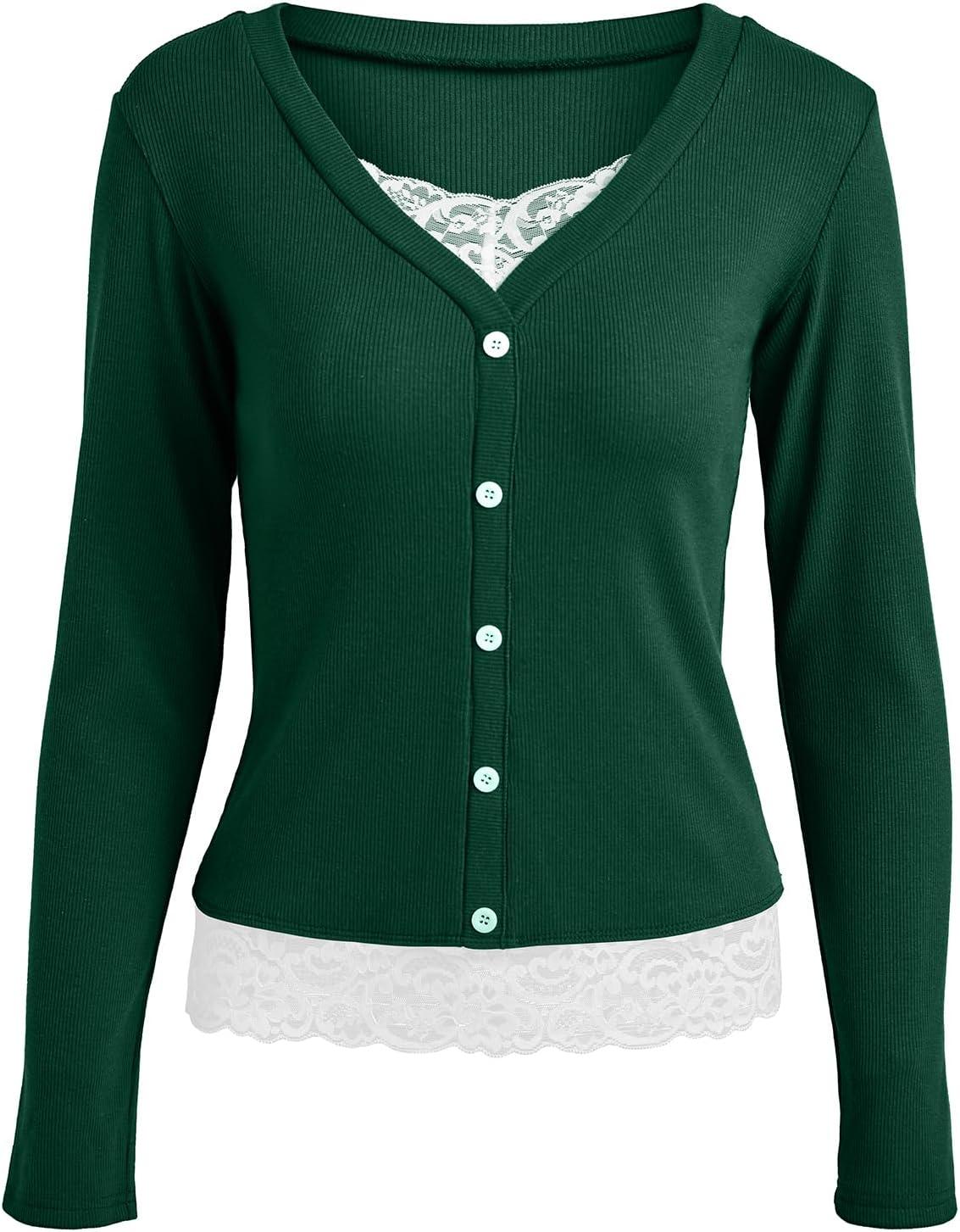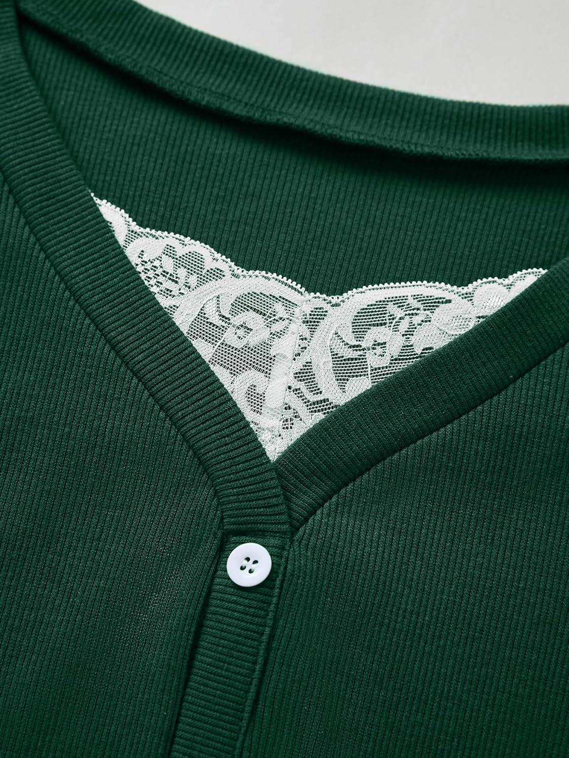 Womens Lace Long Sleeve Top Paneled Henley Shirts Y2k 2000s Fitted Going Out Tops Blouse(Green)