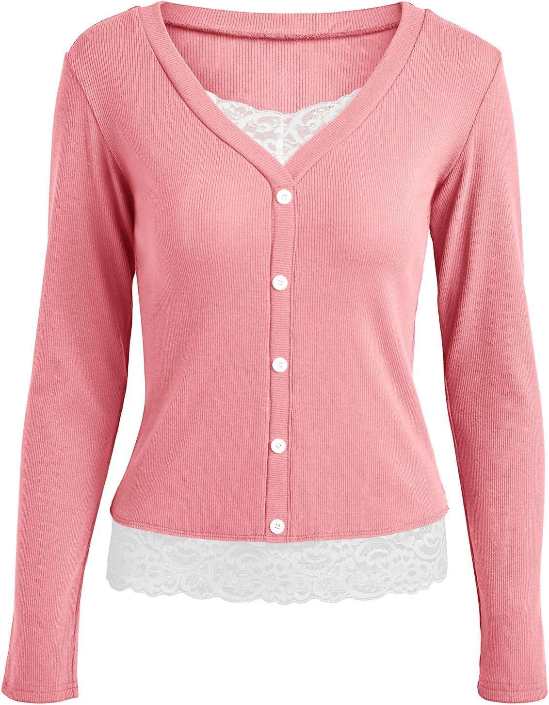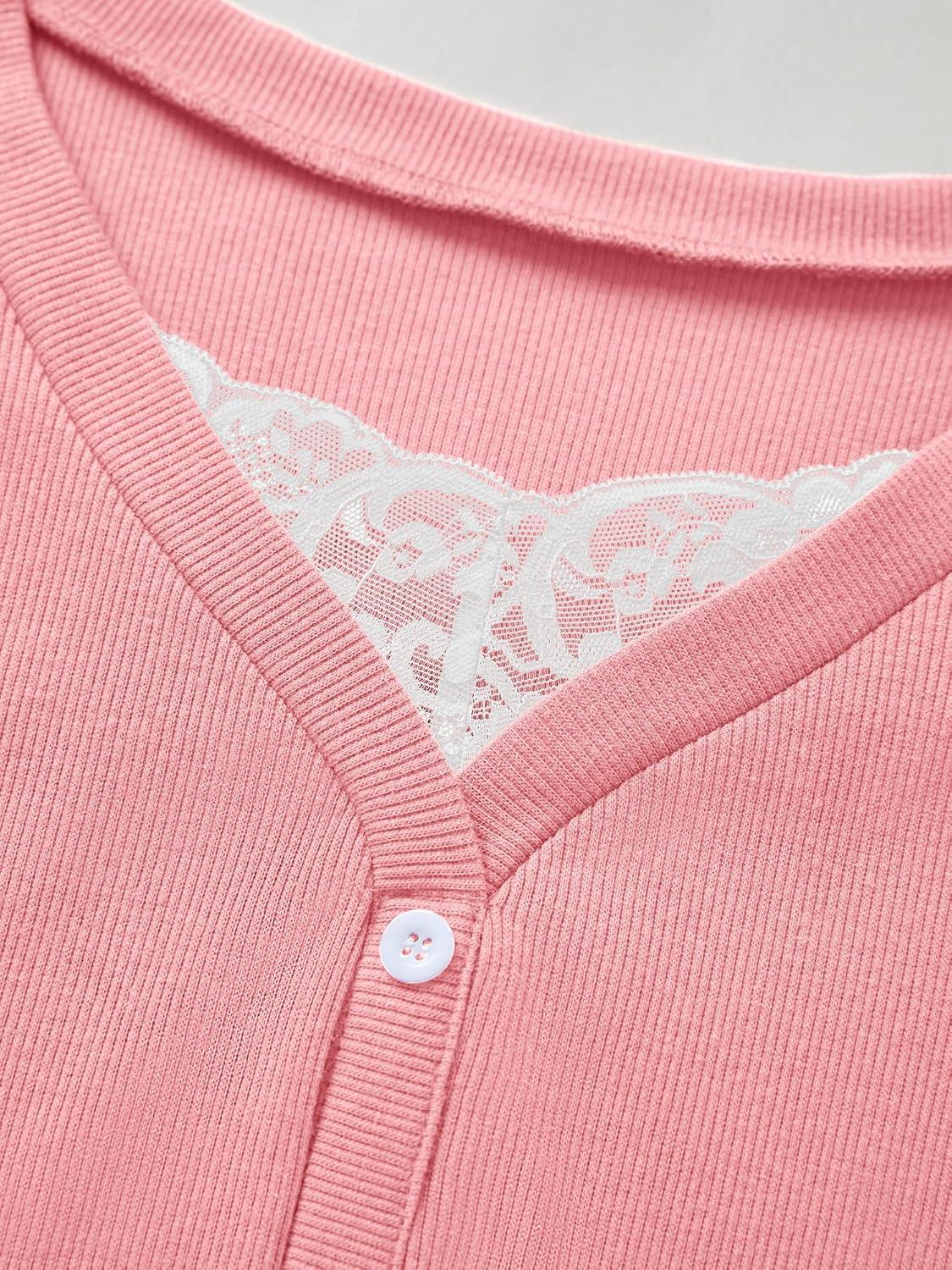Womens Lace Long Sleeve Top Paneled Henley Shirts Y2k 2000s Fitted Going Out Tops Blouse(Pink)