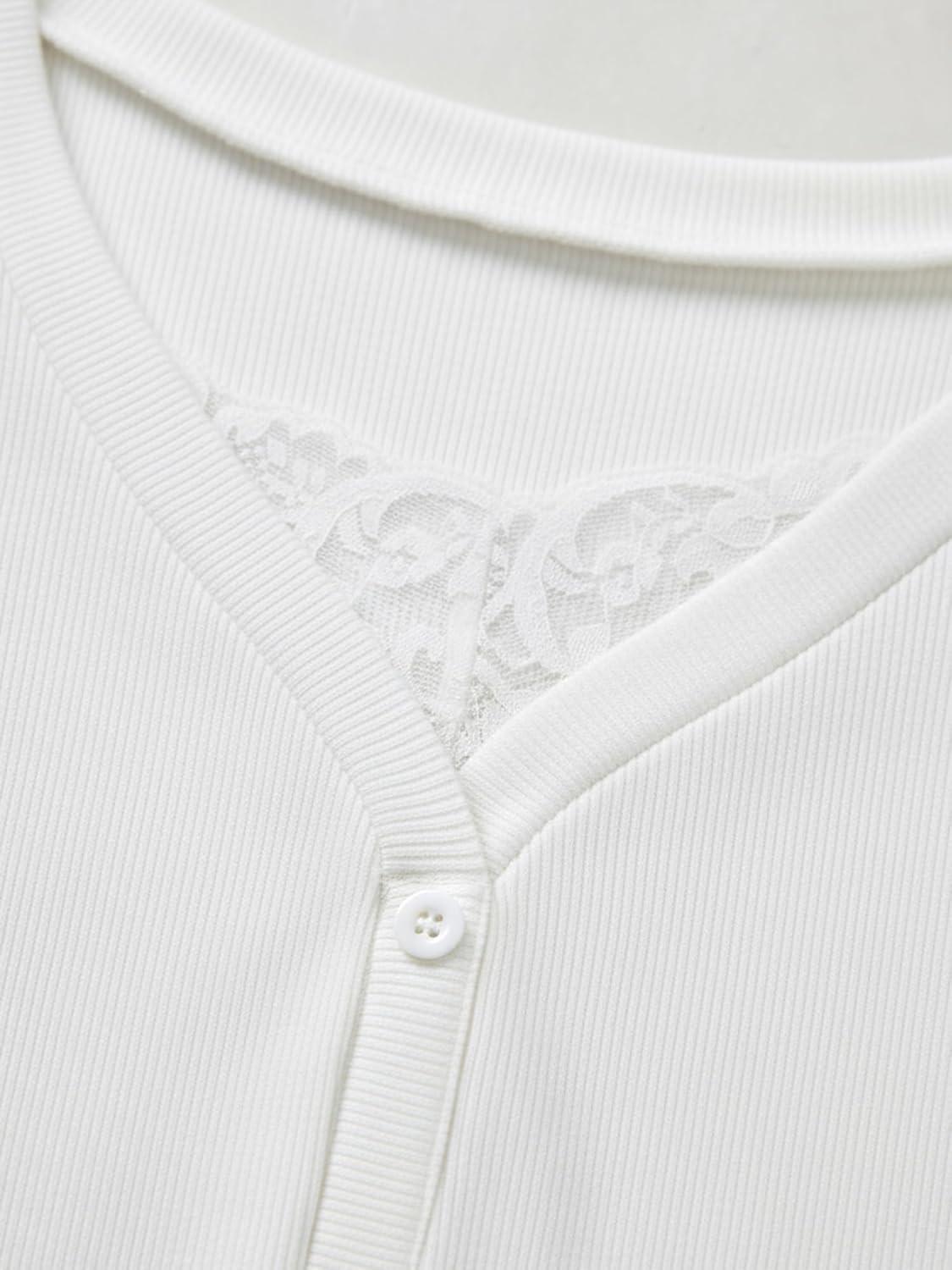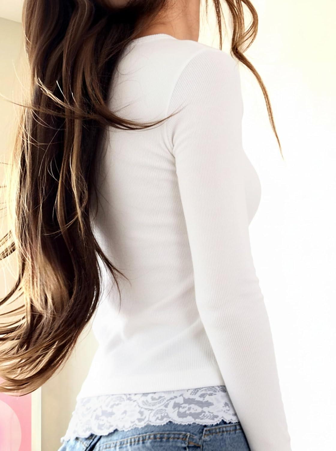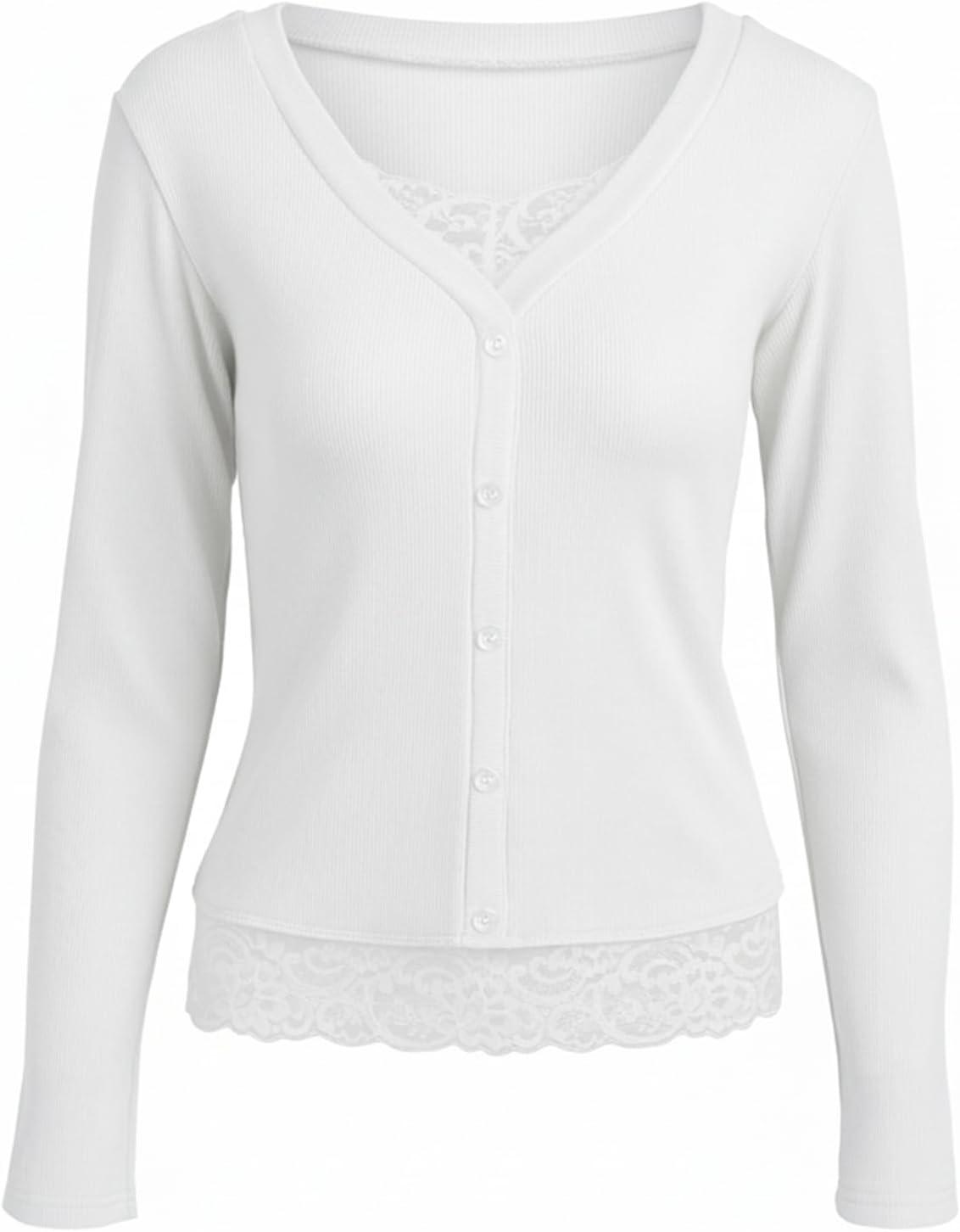 Womens Lace Long Sleeve Top Paneled Henley Shirts Y2k 2000s Fitted Going Out Tops Blouse(White)